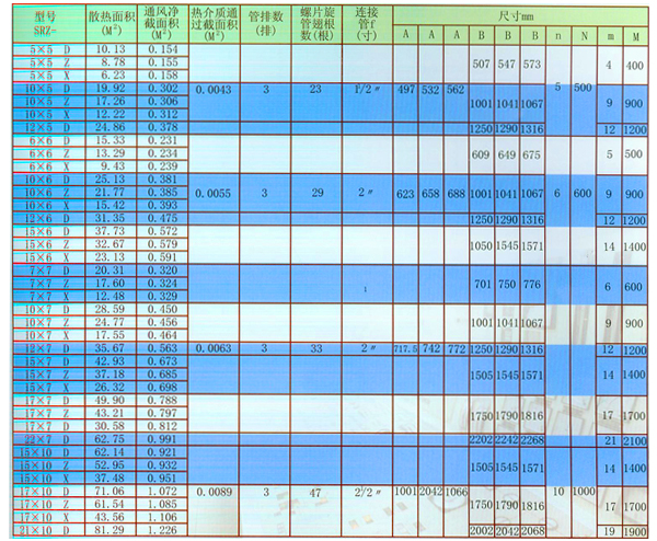 散熱器的翅片管均用中21×21nm尤縫鋼管繞制—1215×、0.5mm皺折鋼帶而成,呈螺旋狀,其中片距:有5mm—大“D”,6mm—中“Z”,8mm-小“X”,三種共有三十八種規格。