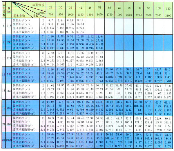GL II型為鋼制雙回路(二排)或多回路(四排)的空氣熱交換揣。翅片管用φ18×2mm無縫鋼管繞制上10×0.3mm鋼帶而成,呈螺絲旋狀,可有各種表面管數,管長排數組成多種規格,進出水管位于同一側,工質熱源為蒸汽或高溫水,冷源為低溫水或鹽水,可用作空氣加熱器或空氣冷卻器,是一種經濟耐用通用散熱器。 GLⅡ型編號方法為: 型號—排數—表面管數—表面管長(英寸)如采用四排,表面管數為10,管長為42英寸時,則為GL II—4—10—42